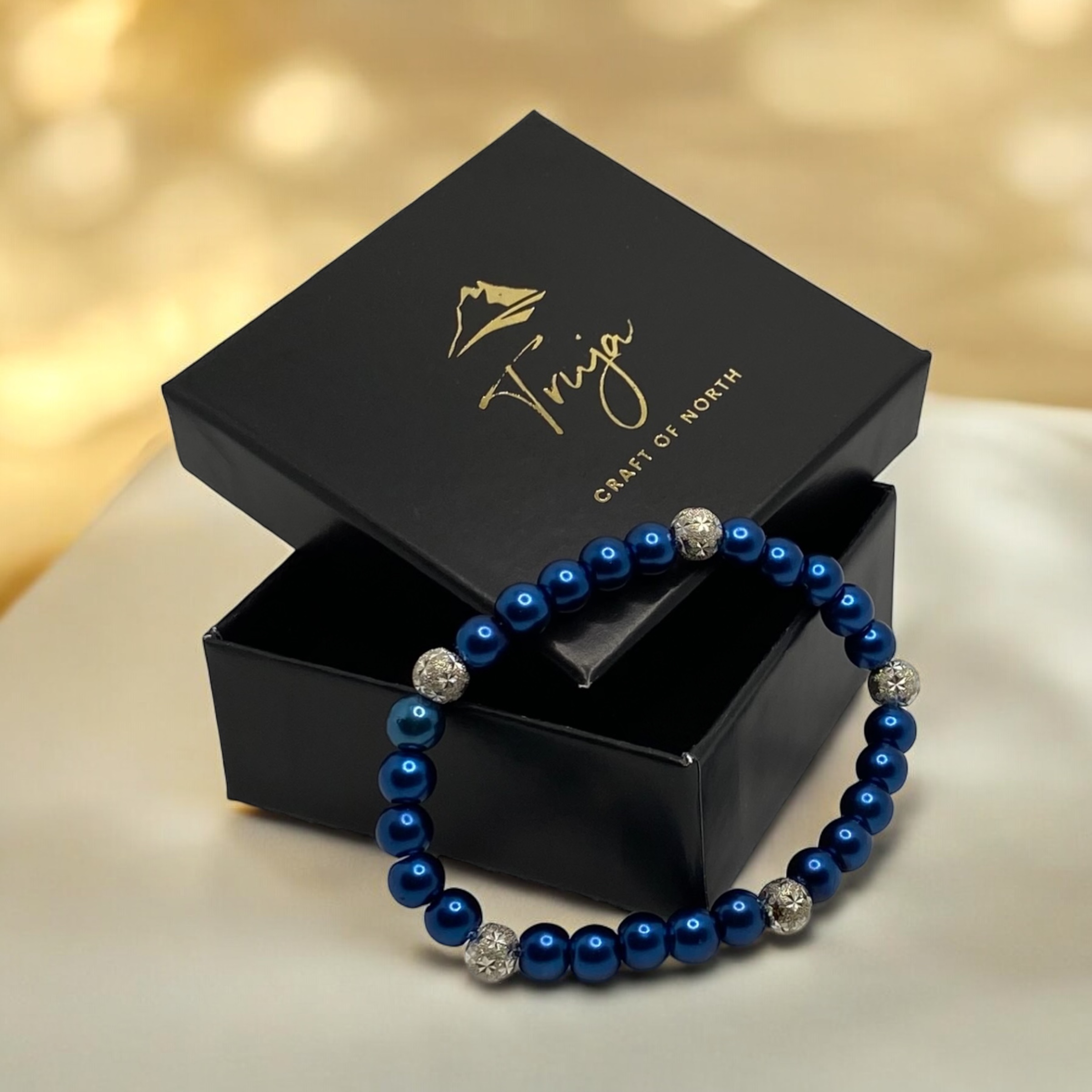 De blå perlene er i glass og ekte store sølvfasett perler.