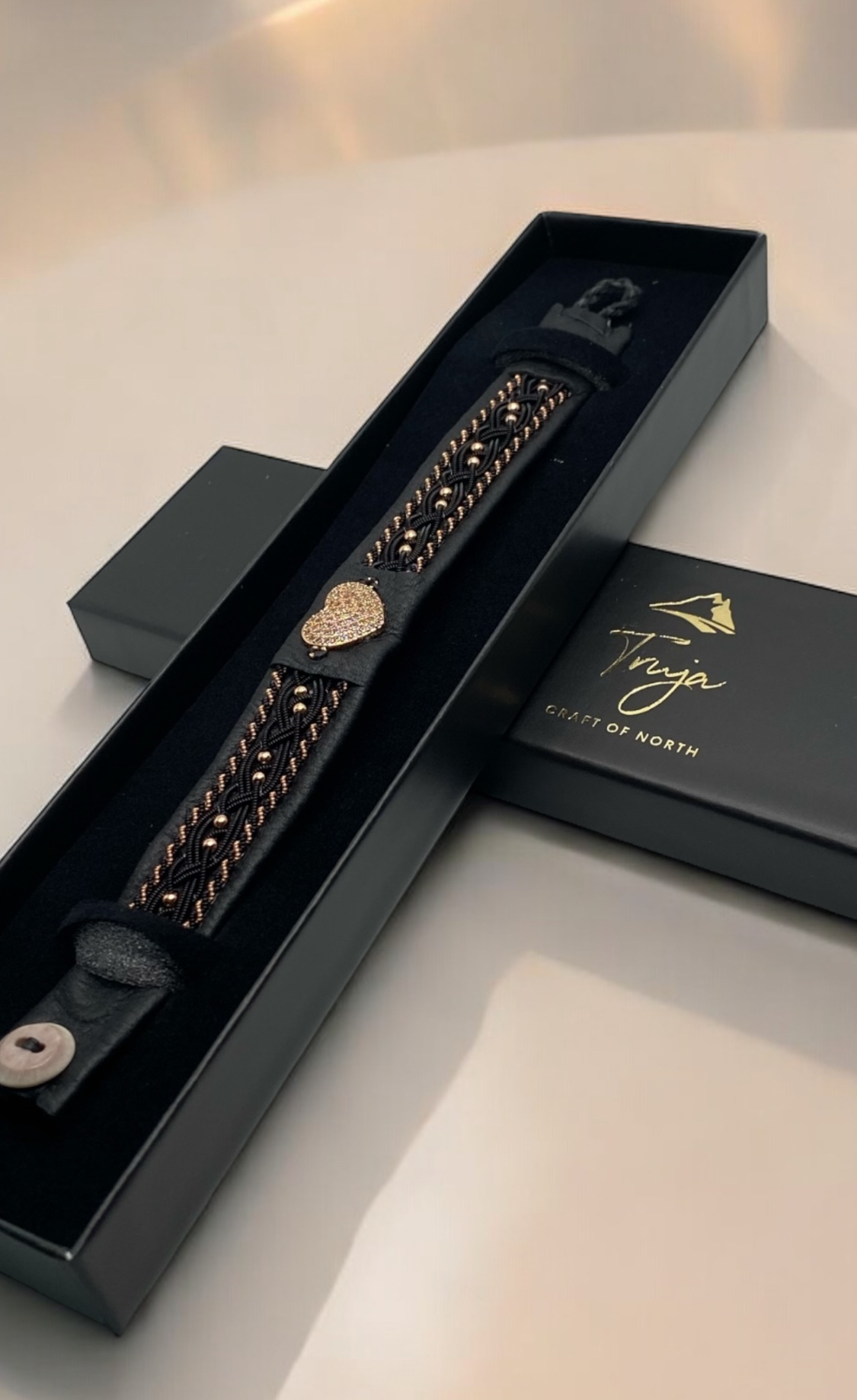 Tinntrådarmbånd i sort skinn med rosegull hjertebrikke med zirkonia steiner, 1,9 cm bred. Ønskes denne i en annen farge kontakt post@truja.no eller skriv i bestillingen.